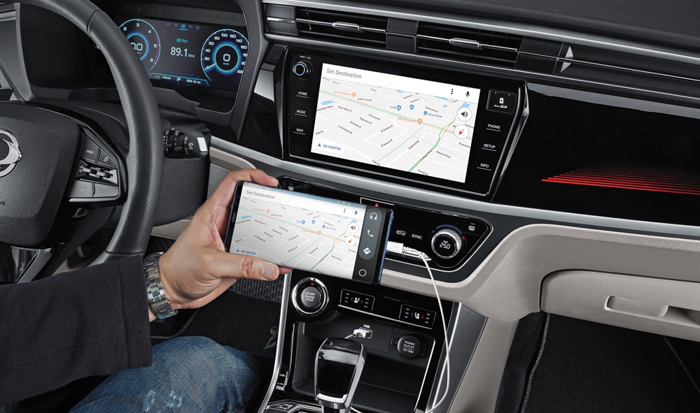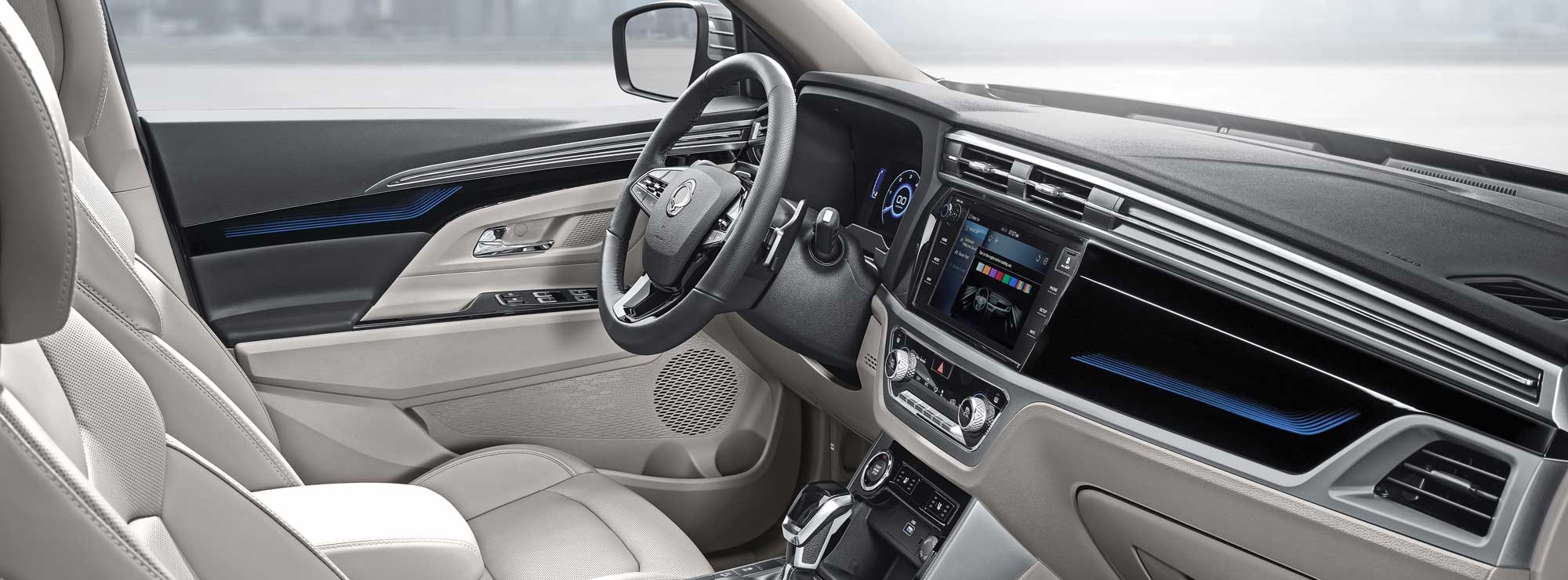 Интерьер нового Korando — это образец современного стиля и высококачественной отделки. Интерьер изобилует металлическими элементами и включает большие 9-дюймовые ЖК-экраны с системой навигации TomTom Navigation и предустановленными сервисами Android Auto и Apple CarPlay, стильную цветную подсветку и роскошные кожаные сиденья.