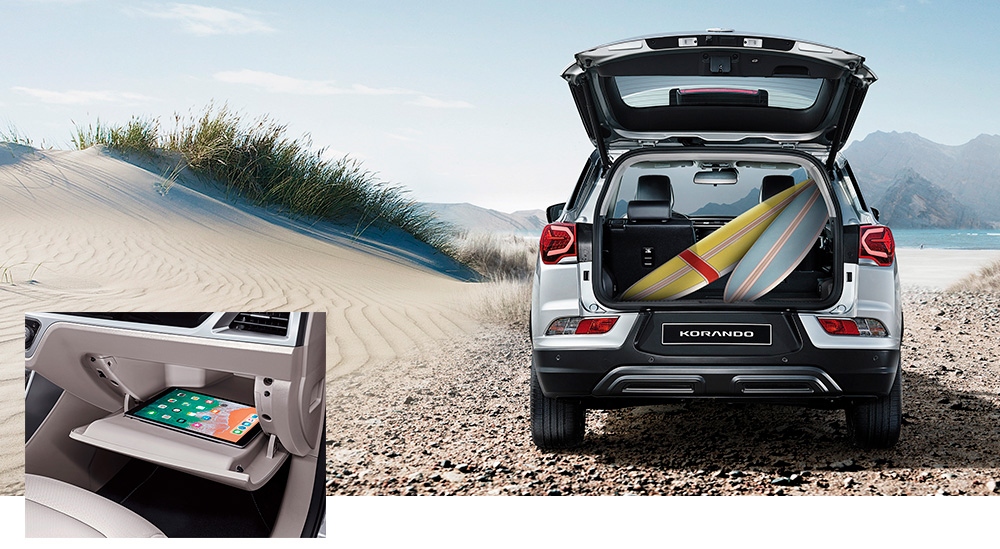 Korando с габаритами 445 см в длину и 187 см в ширину на 4 см длиннее предыдущей модели. Высота автомобиля составляет 162 см, что на 5,5 см меньше, чем у предшественника. Существеннее всего, что колесная база на 25 мм больше, чем у предыдущей модели, и составляет 267,5 см. За счет умелой организации пространства салон машины просторнее, чем у ее главных конкурентов. Достаточно пространства и в новой арматуре – в бардачок, например, легко вмещается ноутбук с монитором 10,5”.